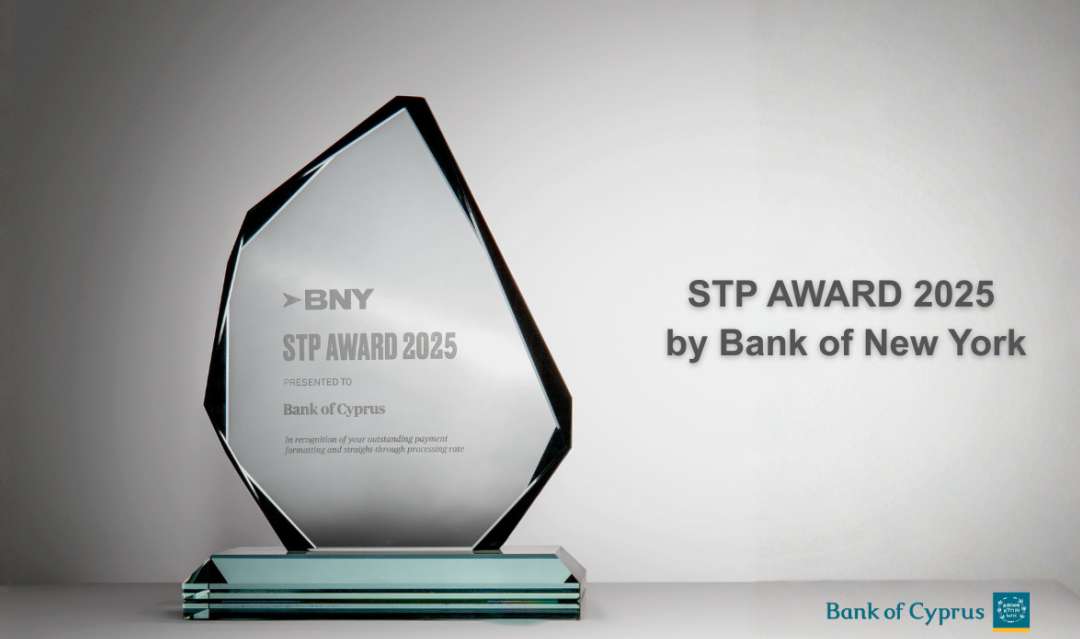 Bank of New York has awarded Bank of Cyprus with the “STP AWARD 2025”, for a fourth consecutive year, in recognition of the high-quality procedures the Bank follows in the area of fund transfers via the SWIFT system.