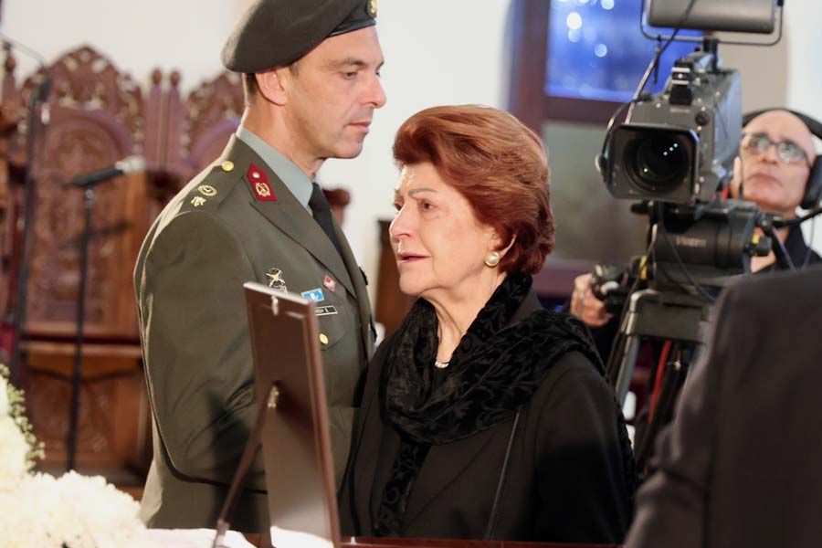 Draped in the flag of the Republic of Cyprus, the coffin was carried by eight members of the military police and escorted by officers. Family members followed, including his wife, former European Commissioner Androulla Vassiliou, who was visibly emotional. The coffin was then placed inside the church.