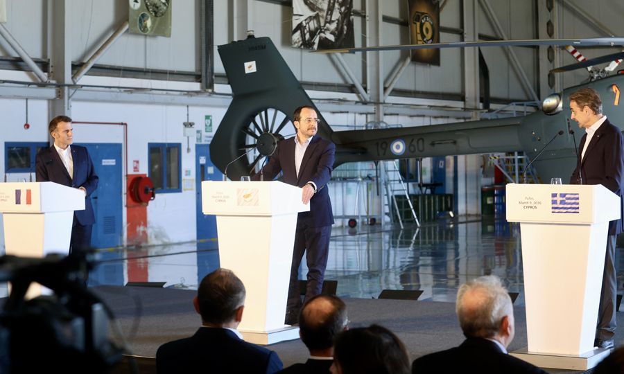 The meeting took place at the “Andreas Papandreou” Air Base in Paphos, where the three leaders held closed-door talks before delivering brief remarks stressing the urgency of the moment.