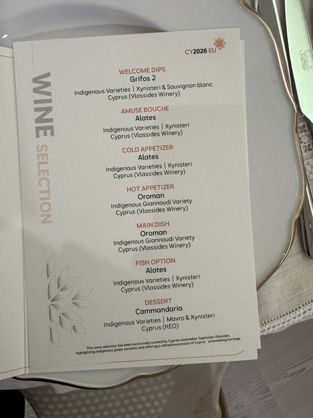 The wine pairing was curated by Sofoklis Vlassides of Vlassides Winery, one of Cyprus’ leading winemakers, with the exception of the starters, which were accompanied by wines from KEO. Indigenous grape varieties took center stage, including Xynisteri, Giannoudi, and Mavro, with Commandaria making a notable appearance.