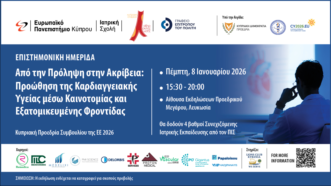 The symposium is jointly organized by the School of Medicine of European University Cyprus, the Cyprus Atherosclerosis Society, and the Office of the Commissioner for the Citizen.